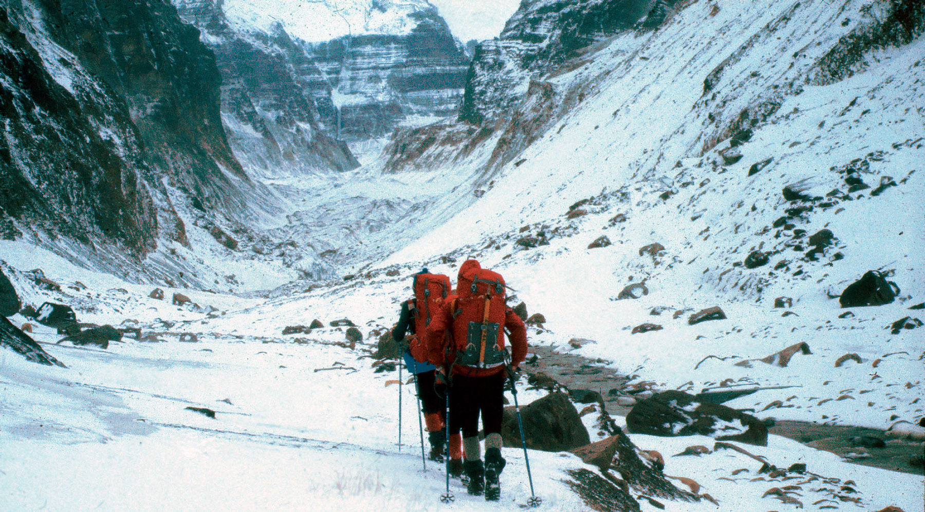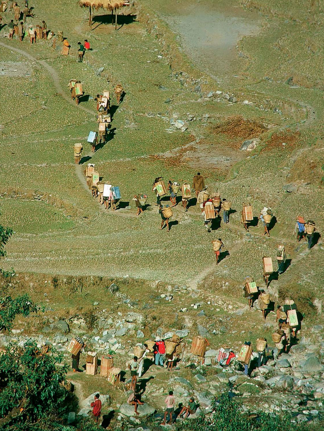 Questo incontro con una civiltà così diversa aumenta ancora di più la volontà di raggiungere l’obiettivo che le Aquile si erano poste: vivere la montagna che li attendeva, rimanendo compatti ed uniti.Finalmente si parte da Katmandu per Pokhara, dove inizia l’avventura: trecentosettanta portatori e nove sherpas risalgono le vallate che portano alla base del Dhaulagiri, che in nepalese significa Montagna Bianca. Solamente il 23 marzo 1976 riuscirono ad allestire il Campo Base, senza i portatori che già da cinque giorni, ricevuta la paga di 18 rupie al giorno, se n’erano andati di corsa verso valle.