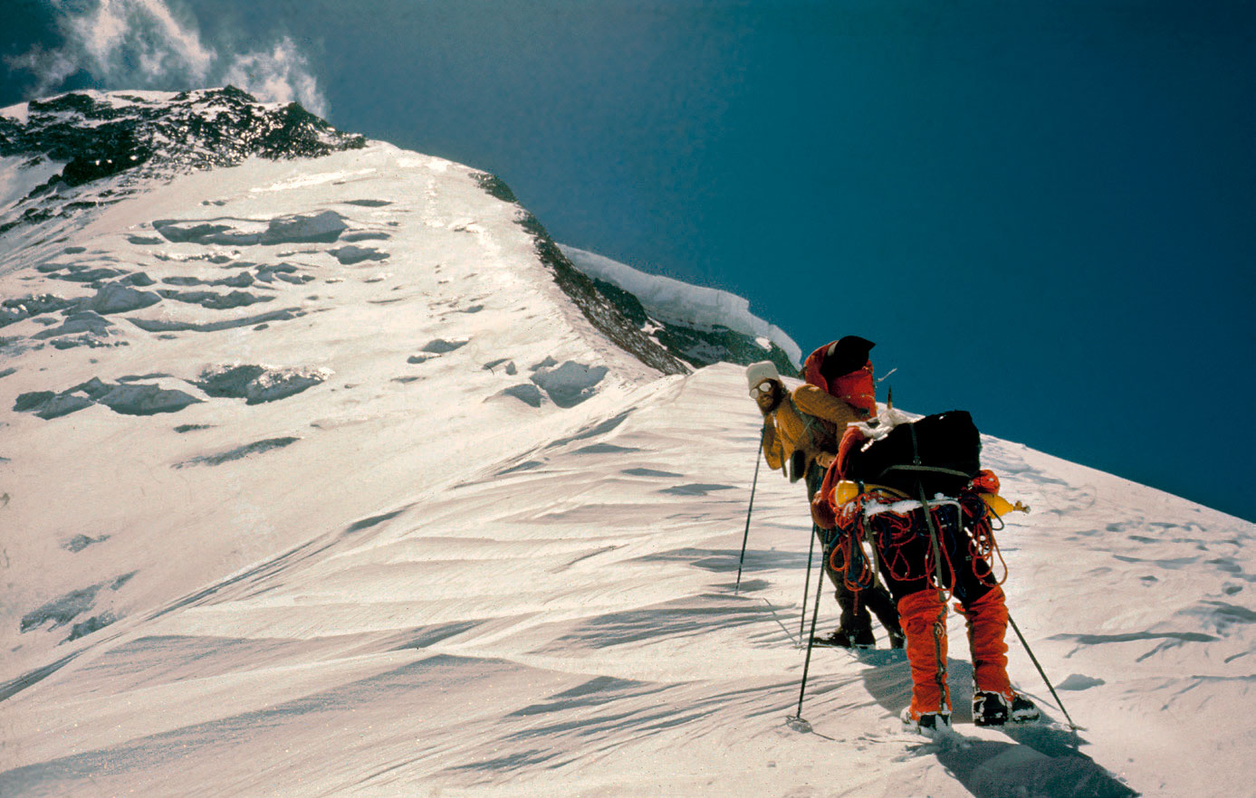 L’ultimo tratto abbastanza ripido ci richiede molta fatica,anche se l’altimetro ci assicura una quota vicina alla vetta. Dopo 3 ore di penoso procedere all 14,30 ci rendiamo conto che davanti a noi la cresta scende precipitosamente verso sud-ovest. La quota dell’altimetro ci dà 8.192. La vetta! Dopo 47 giorni sù e giù, il Dhaulagiri è vinto e, quasi imbronciato per la nostra presenza, non ci ha voluto regalare neppure un attimo di schiarita. Tentiamo invano un collegamento radio, ci facciamo delle foto, beviamo un po’ di thè e insieme con la bandiera della spedizione piantiamo la bandiera italiana e quella nepalese. Ci sentiamo profondamente soddisfatti, consapevoli di aver portato a termine un grosso impegno. La gioia è grande, ma bisogna ritornare e riabbracciare gli amici per festeggiare assieme la vittoria. Ci buttiamo in discesa sprofondando nella neve fino al campo 5 dove Luciano ha preparato il thè. Stà nevicando, la montagna diventa buia, siamo stanchissimi, vorremmo buttarci nel sacco a pelo, ma convinti da Luciano scendiamo al campo 4 portando con noi ciò che possiamo. Alle 16,30 abbiamo dato notizia a Renzo al campo 2 e la grande gioia è rimbalzata anche ai campi bassi.