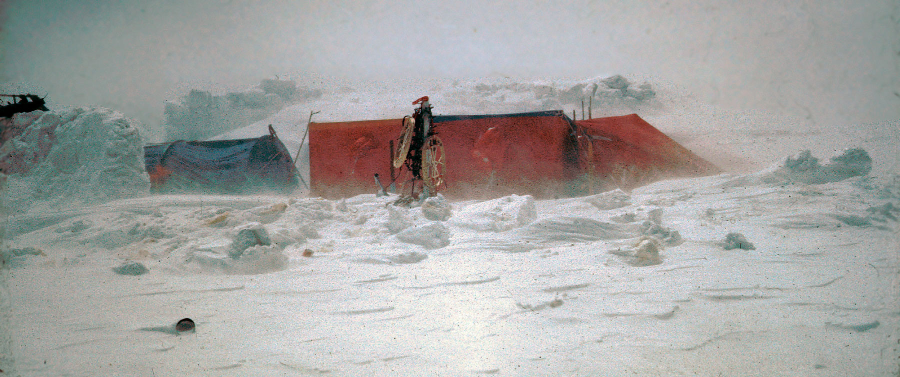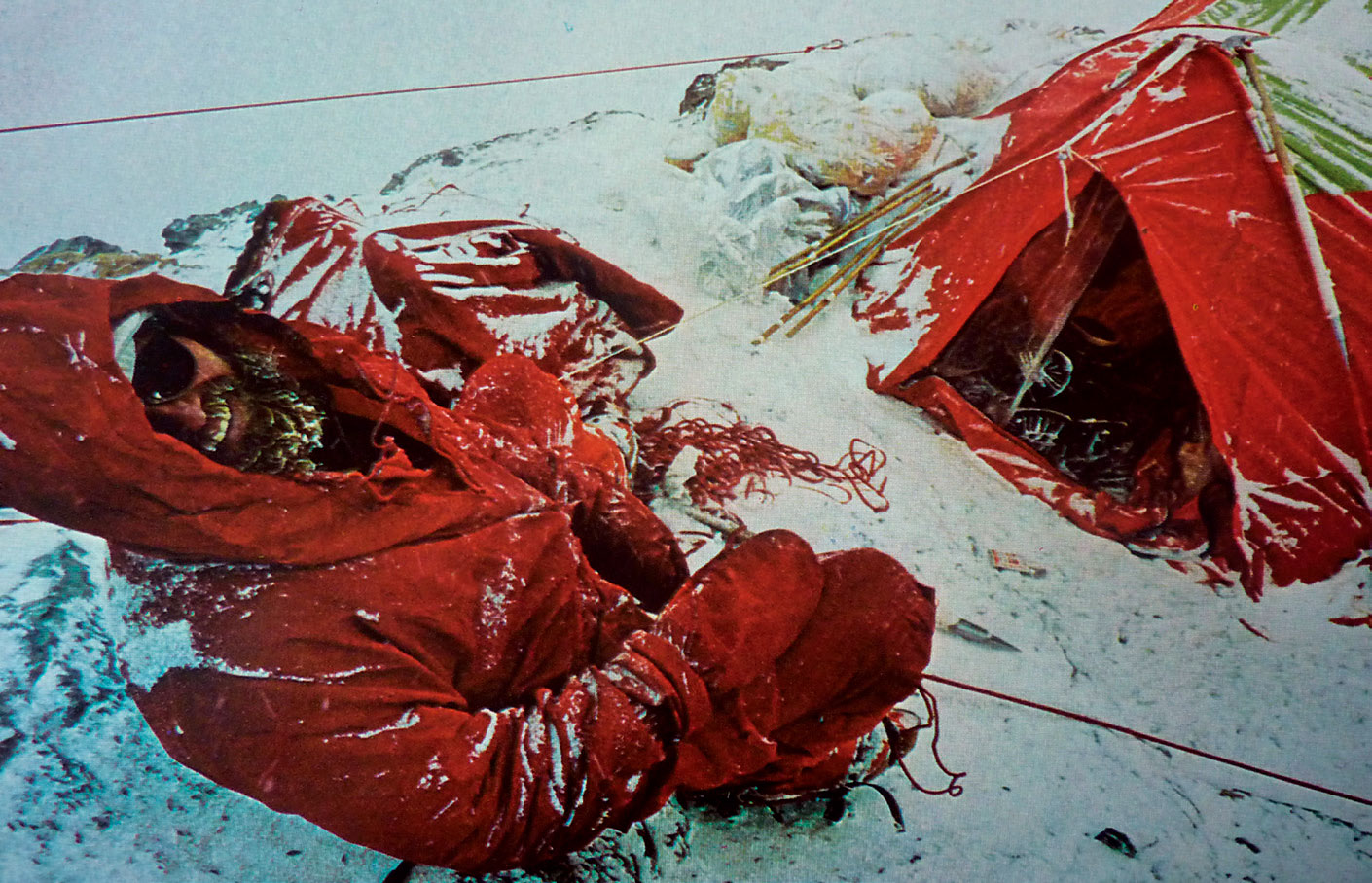 Ma è sempre muto, la mia tensione è al massimo e l’ impossibilità di agire mi tormenta. Le ore passano con una lentezza esasperante, non si vede nulla, la montagna è sepolta nella nebbia. Il vento solleva turbini di neve, frammenti quasi impalpabili di ghiaccio che mi investono, ho la barba che è un blocco bianco.Ore 16.30 – La radio si risveglia. La fioca voce di Gadenz mi comunica che la vetta è stata raggiunta. Non riesco a parlare, a rispondere, a chiedere qualcosa tanta è l’emozione che mi prende e mi soffoca. Io chiamo e mi faccio ripetere il messaggio. Me lo conferma e mi dice che è arrivato a 7900 poi è dovuto scendere al Campo V. Zortea e Simoni sono arrivati in Cima alle 14.30. Ora sono lì con lui nella tendina stanchissimi e provati. Vorrei parlare con Zortea, ma è troppo stanco per rispondermi. Ore 19.15 Gadenz mi comunica che ora sono tutti al Campo IV. Sta bene ma gli altri fanno fatica a respirare e chiede consiglio al medico per aiutarli. 5 maggio -Nessuno ha dormito al Colle. Alle 8.15 dal Campo IV mi dicono che hanno trascorso una notte insonne e agitata. Alle 13 arriva Zortea, si trascina a fatica, lo abbraccio piangendo in un misto di gioia e riconoscenza. Mezz’ora dopo arriva Silvio, ma sembra il suo fantasma, è ubriaco di stanchezza. Poi arriva Gadenz allegro, sereno e felice. Le ore, lunghe ore di angosciosa attesa sono finite. Posso dormire.