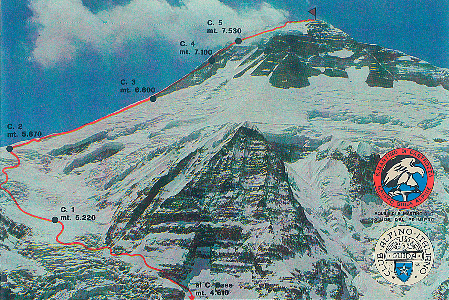 Una impresa alpinistica è ben difficilmente collocabile in una graduatoria assoluta, fatto com’è di troppi elementi, umani, tecnici, ambientali ed anche di imponderabilità, ma si può affermare che la salita al Dhaulagiri del 1976 merita un posto di primissimo ordine. “Successo prezioso” titolava un articolo di Alessandro Gogna (noto alpinista e scrittore) su TuttoSport del 12 Giugno 1976. “Non si era mai dato il caso che un gruppo di Guide avesse la idea, organizzasse ed eseguisse interamente con le proprie forze e buona volontà un’impresa di questo genere… Molto spesso, in partenza, si dubita che l’entusiasmo basti. Ma non vorrei insistere soltanto sul valore morale di questi uomini perchè essi hanno dimostrato che è possibile creare in una spedizione un’intesa perfetta, che oggi si può salire un 8000 con appena due mesi di preparazione logistica, che si possono ridurre i costi con l’adozione di cibo locale per lunghe permanenze al Campo Base ,risparmiando così su trasporti e dogane”. In campo Italiano sugli 8000 c’erano state la conquista del K2 di Desio e l’Everest di Monzino con due sfortunati tentativi all’Annapurna e al Lhotse, spedizioni che richiesero tempi lunghissimi di preparazione e costi astronomici e che lasciarono lunghe polemiche e rivalità. Il Dhaulagiri I è una montagna molto impegnativa e fino a quel momento moltissimi erano stati i tentativi di salita dai vari versanti e solamente tre spedizioni vi erano riuscite. Nel 1950 era stato avvicinato dalla spedizione francese di Maurice Herzog che però aveva ripiegato sull’Annapurna conquistandola come primo 8000. Nel 1960 la spedizione svizzera di Max Eiselin effettua la prima salita lungo la cresta NordEst, supportata da un aereo Pilatus, chiamato Yeti, per i rifornimenti al colle NE 5750 metri. Nel 1970 sono i Giapponesi di Tokufu Ota e Shoji Imanari che salgono per quella che verrà poi considerata la via normale. Nel 1973 la spedizione americana di James Morrissey effettua un tentativo alla affilata cresta SudEst per poi ripiegare sulla cresta NE e coronare la salita il 12 maggio con seri congelamenti a Roskelley. Anche gli Americani usufruirono dei rifornimenti di un aereo fino al colle considerato il loro Campo Base, così da avere enorme quantità di materiali tecnici e alimentari. Saranno i viveri trovati nei resti del loro Campo 2 tra i nostri Campi 4 e 5 ad aiutarci gli ultimi giorni in quota e sopra-tutto a sollevarci dallo scoramento della inadeguatezza oltre che della scarsità della nostra alimentazione ai campi alti. Emanuele Cassarà, giornalista e scrittore di montagna, nel suo libro “Un Alpinismo Irripetibile” descrive la via di NordEst come una lunga cresta nevosa che inizia al colle NE a 5870 metri paragonata da Luigino Henry alla Kupfner o alle difficoltà dello Sperone della Brenva al Monte Bianco ma di sviluppo doppio.