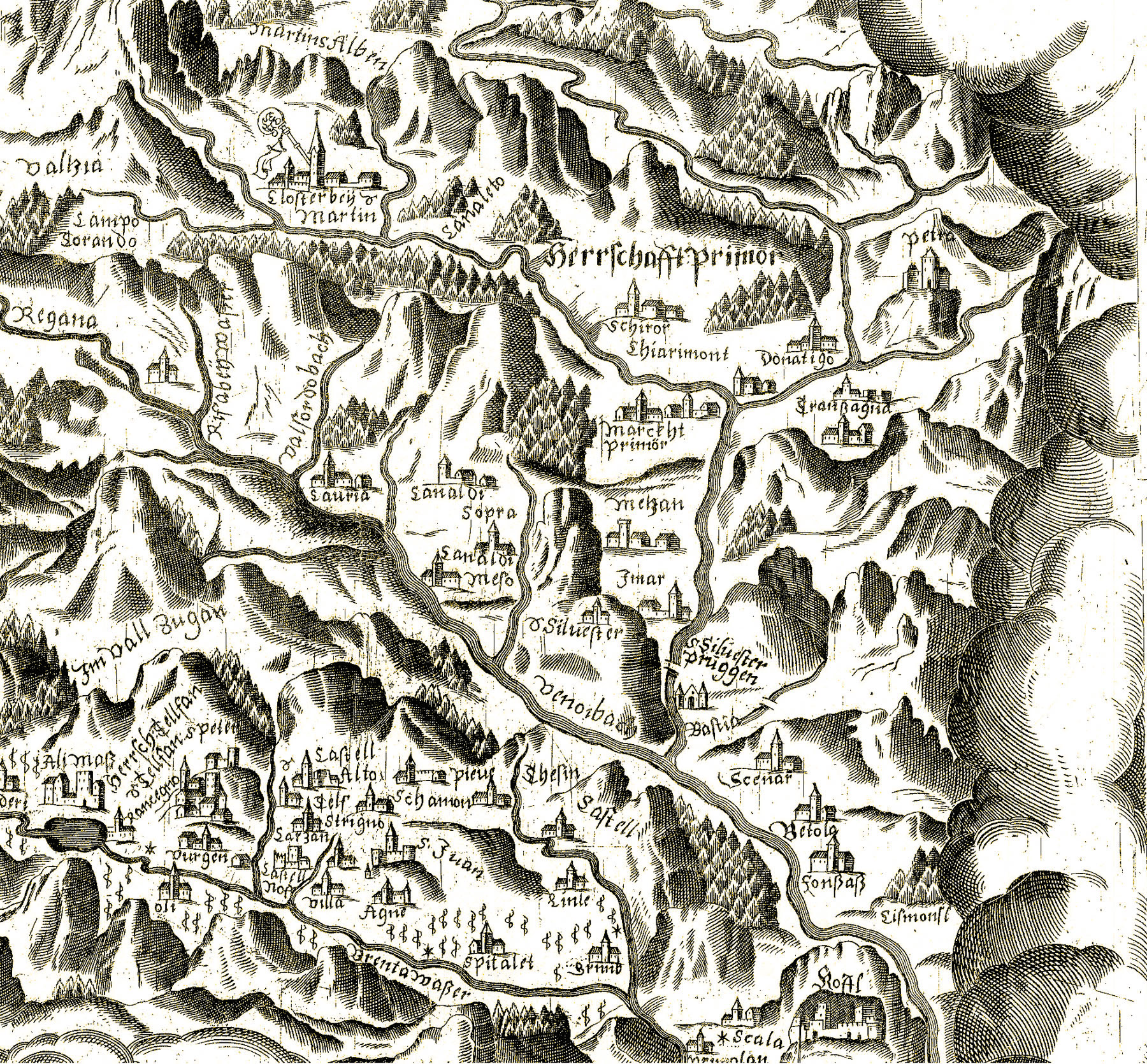 Questa sembra essere la prima documentazione cartografica di un toponimo alpino della zona: Aralis, è interpretabile come “area”, da cui potrebbe in seguito derivere “Rolle”; Albm, invece, segnala che l’ area è dedicata ad alpeggio, derivando, forse, da alb, oronimo che significherebbe monte, altura, pietra, ma che indica anche “pascoli di montagna” (un’Alpe Rolle fu acquisita dal convento di San Martino nel XIII secolo). A nord ovest è rappresentato localmente un M Colloritzon albm (forse pascolo del monte Colbricon). Il carattere montagnoso del paese è reso manifesto da numerosi disegni schematici di monti a cono di talpa, a volte ingranditi e posizionati a caso. Di poco posteriore (1611) è la carta7, opera famosa anche per un certo stile grafico barocco, di Mathias Burgklehner, funzionario del governo per le questioni territoriali di confine, specialmente con la repubblica di Venezia.