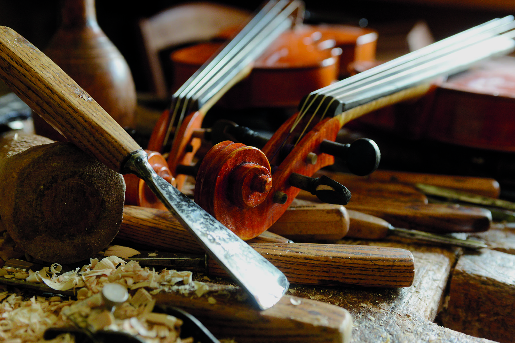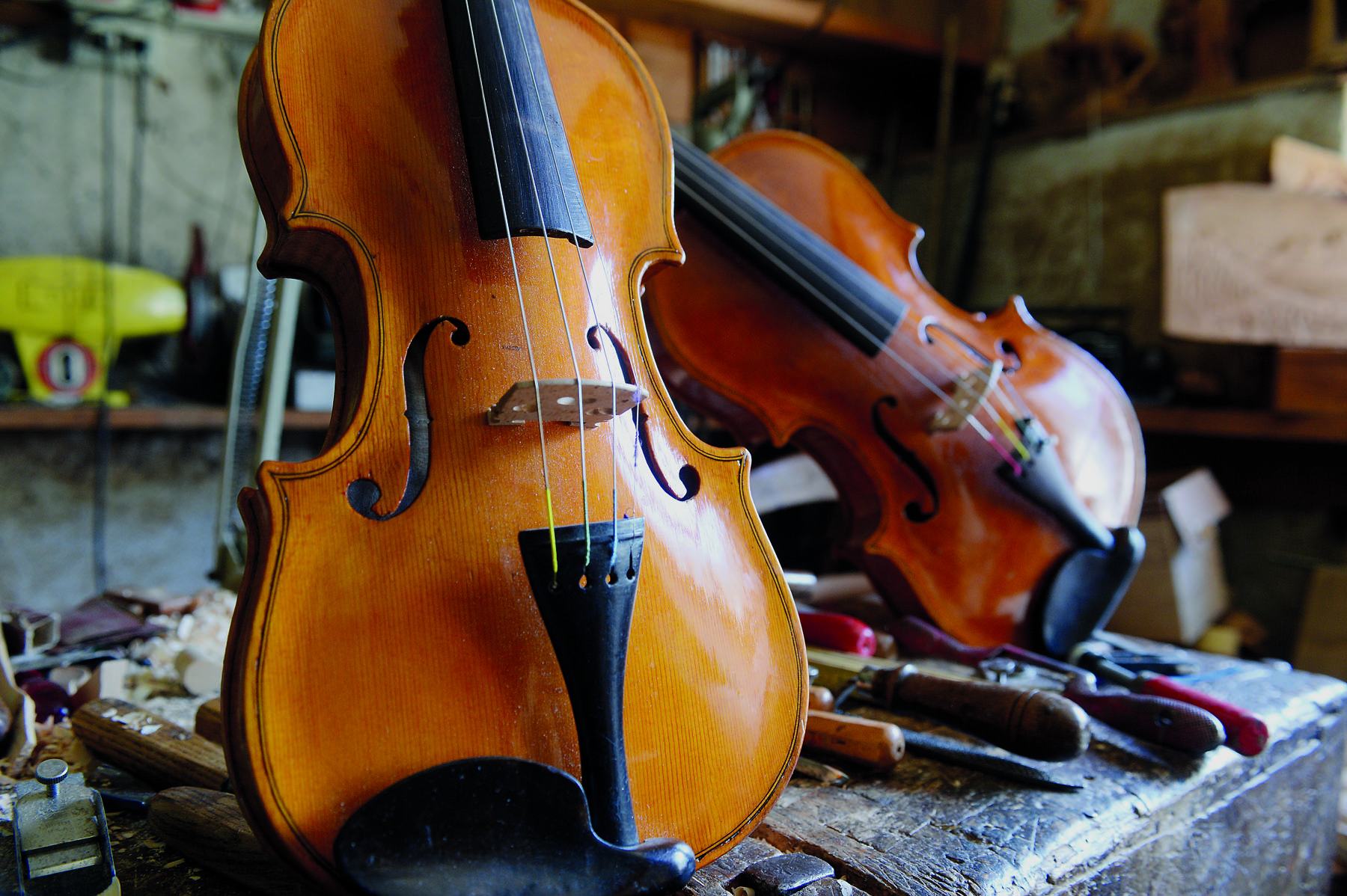 Giovanni non lavora più, a meno che non ci sia l’occasione, ormai la fatica e la difficoltà a muoversi hanno preso il sopravvento, dal 1996 una forma costrittiva, meccanica della gabbia toracica schiacciata lo costringe a respirare l’ossigeno da una bombola, ma è sempre pronto e disponibile ad aprire il suo regno, che è lì, con ancora tutti gli attrezzi del mestiere e le sculture da terminare. Le sue figure appena abbozzate sembrano dire: “Vedrai che torna, ci finirà prima o poi”. Lui non scende più nel suo laboratorio, ma fiducioso, ti lascia le chiavi di una parte di sé. Tanto, i pezzi più “cari” sono custoditi in una vetrinetta in camera sua: quattro viole di dimensioni diverse, pronte per essere suonate, uscite dall’intaglio sapiente di Giovanni. Qui comincia a ritroso, la storia di un’altra passione, quella della costruzione di spettacolari strumenti a corde: liuti, viole e violini, in tutto ne crea una dozzina.