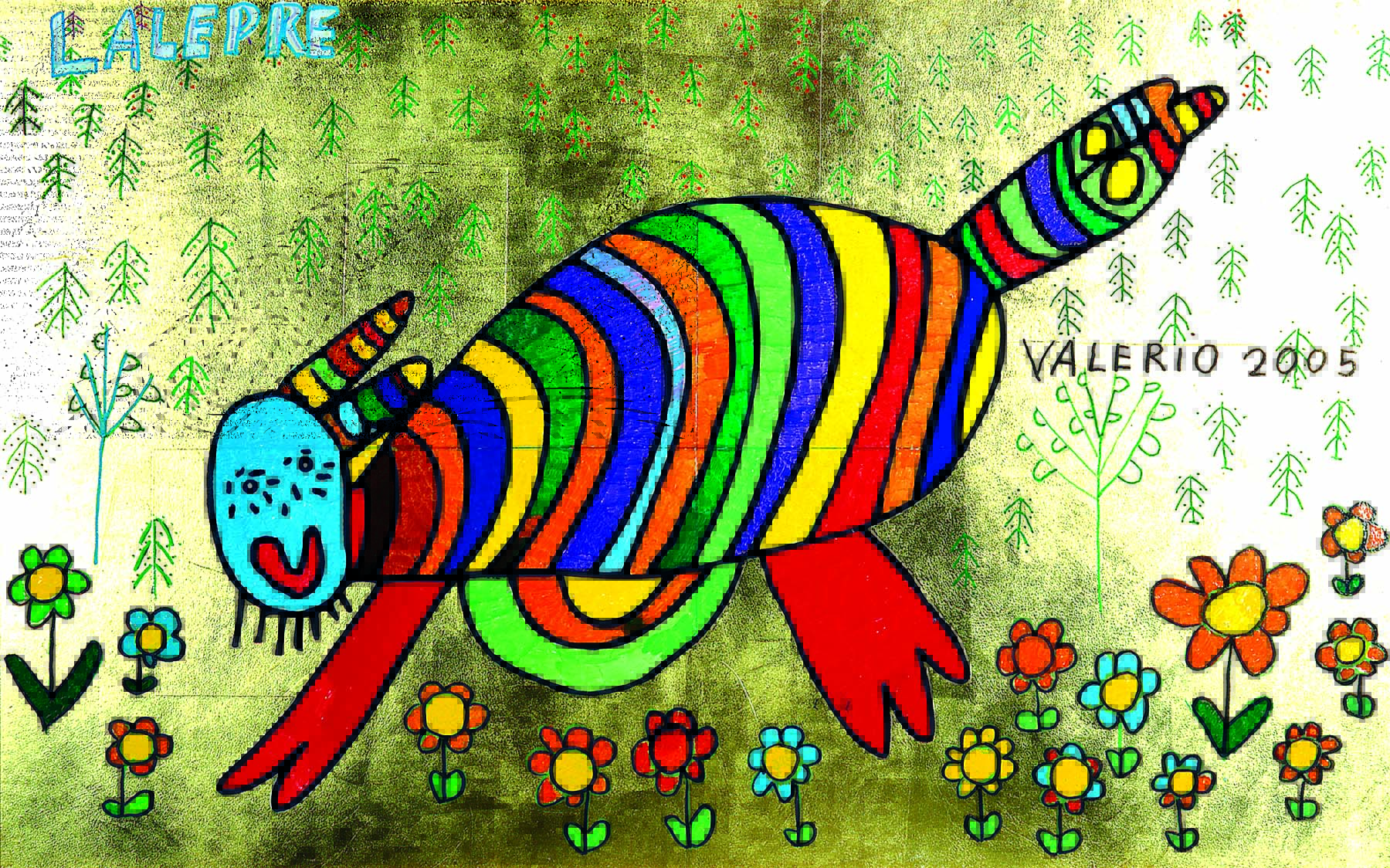 Valerio comincia a cimentarsi nell’arte del colore al Laboratorio sociale, grazie all’intuizione del pedagogista Angelo Luigi Sangalli che suggerisce di scannerizzare al computer le sue figure mignon e portarle alle dimensioni di un quadro. Nel giro di due anni, Valerio affina la propria abilità pittorica sotto la guida e l’ala protettrice di Valerio Pistoia, poliedrico artista di Mezzano che lo ha seguito passo passo accompagnandolo a scoprire ed esprimere la propria inclinazione, e Michele Salvadori, che ha trascorso diciotto anni con lui, introducendolo prima all’arte della ceramica, poi sviluppando assieme il mosaico, finché lo ha seguito nella pittura. Ecco che i piccoli disegni sono stampati in dimensioni maggiori, su più fogli: la stampa è un riga blu, nulla più. I contorni sono ritagliati, la figura completa assemblata e applicata ad un fondo, in genere già preparato. Le tecniche proposte da Valerio Pistoia erano varie, predilette erano la foglia d’oro, di rame o d’argento. In questo, Valerio Pistoia era un mago.