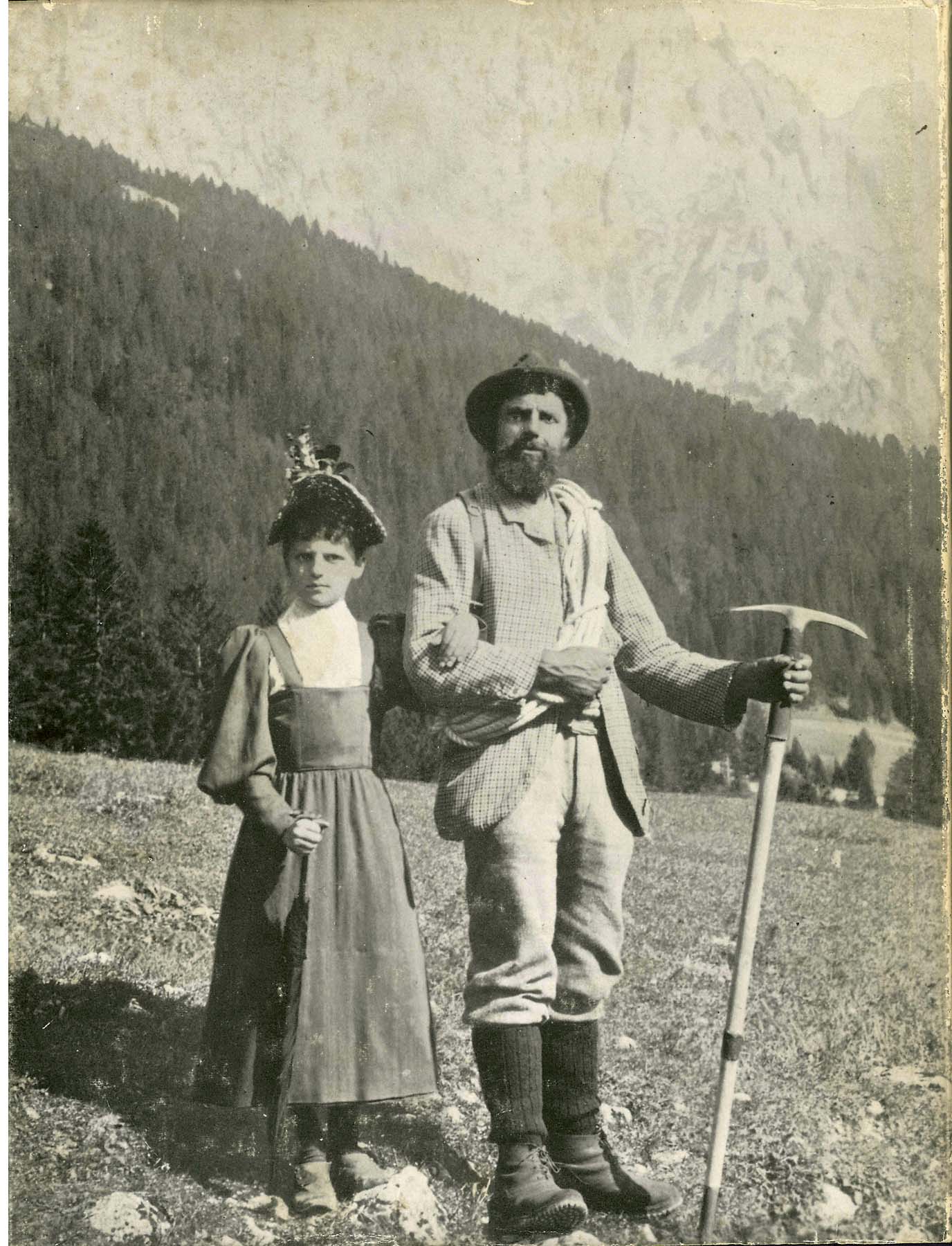Del resto, si troveranno ad accompagnare alcuni alpinisti dalla personalità fuori dal comune. Beatrice Sybil Tomasson (Nottingham, 1859-Little Benhams, 1947), educatrice presso i salotti dell’alta società degli Imperi Centrali, è una donna arcigna, caparbia e sfuggente; nubile fino alla sessantina. Una viaggiatrice defilata, tanto che gli unici segni di passaggio sono alcune corrispondenze spedite dagli hotel di qualche capitale europea, oltre a ciò che lascia scritto delle sue scalate nei libretti delle guide che puntualmente assume. Eppure si tratta della “migliore rocciatrice del Tirolo”, come ebbe a definirla Edward Leslie Strutt, futuro presidente dell’Alpine Club che la conobbe molto bene. Un modello femminile, il suo, che si posiziona al di fuori dei canonici ruoli di moglie e madre. Tant’è che trentottenne, nel giugno del 1897, accompagnata da Michele Bettega, s’introduce nella catena meridionale delle Pale, in quello che Euringer nei suoi studi aveva definito Der Zug der Croda Grande, ed è la prima donna a farlo. Fu una campagna alpinistica densa di successi quali la prima ascensione dei Lastei d’Agner, la terza salita al Sass d’Ortiga, la seconda alla Cima delle Sedole, la seconda alla Pala della Madonna (peraltro insieme a Oscar Schuster); e ancora la terza ascensione della Croda Grande, la seconda alla Cima del Coro, la prima traversata della Cima dell’Alberghetto, etc. Il tour dolomitico durò fino a fine luglio, contemplando anche Sassolungo e Odle, per concludersi ancora sulle Pale. Dopo un brillante intermezzo tra le vette delle Alpi centrali, nell’estate del 1901 la Tomasson ritornerà sulle Dolomiti inseguendo progetti ambiziosi. Ancora in Val Canali, con il team Bettega-Zagonel, l’alpinista inglese omaggerà la sua terra inaugurando due vette con gli appellativi di Campanile della Regina Vittoria e Torre del Giubileo, così ricordando il sessantesimo anno di regno della Sovrana. Entrambi i nomi troveranno formale battesimo esclusivamente nel libretto di guida di Bettega. Come nelle stagioni precedenti, infatti, anche questa volta Beatrice Tomasson non lascerà troppi indizi sulla sua strada se non, il primo luglio, la sua decisa impronta sulla parete sud della Marmolada.