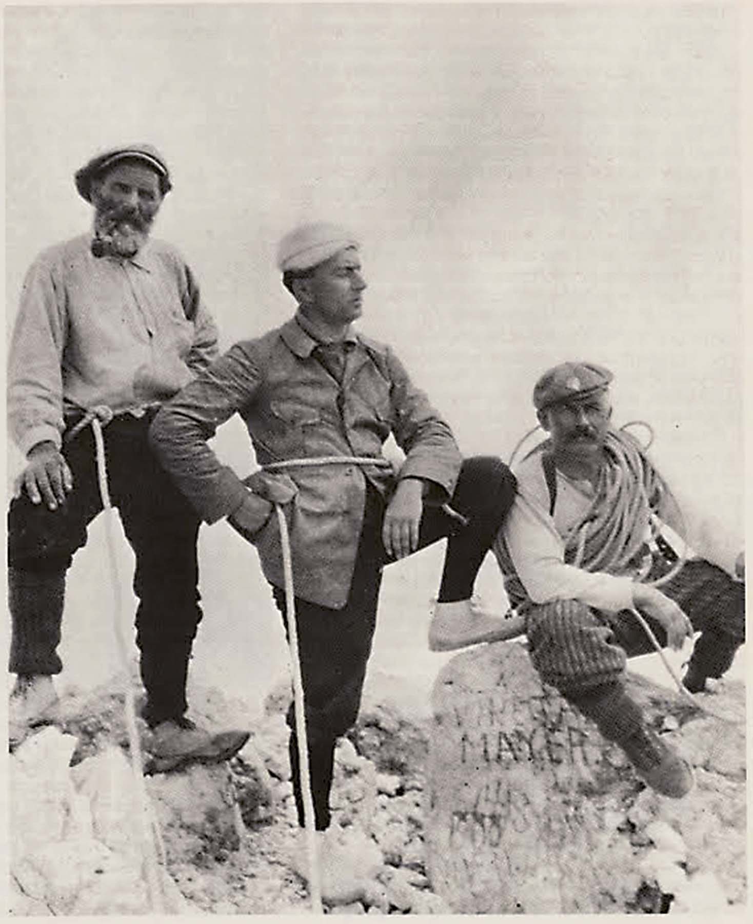 La spedizione era partita in carrozza, una decina di giorni prima, dall’Hotel Toblach, in Pusteria, ed era transitata al “Croce Bianca”, ad Ampezzo, qui ingaggiando due collaudate guide alpine: Santo Siorpaes e Arcangelo Dimai. Se il primo non aveva certo bisogno di presentazioni, pure il secondo offriva buone referenze, aderendo alle orme tracciate dal padre Angelo, capostipite del ramo famigliare dei Dèo guide alpine. Eppure con l’arcigna Pala lo stesso Siorpaes, senza dubbio la più rappresentativa guida del primo pionierismo dolomitico, aveva un conto in sospeso che sembrava non riuscire a chiudere, avendone già fallito la salita per ben cinque volte.