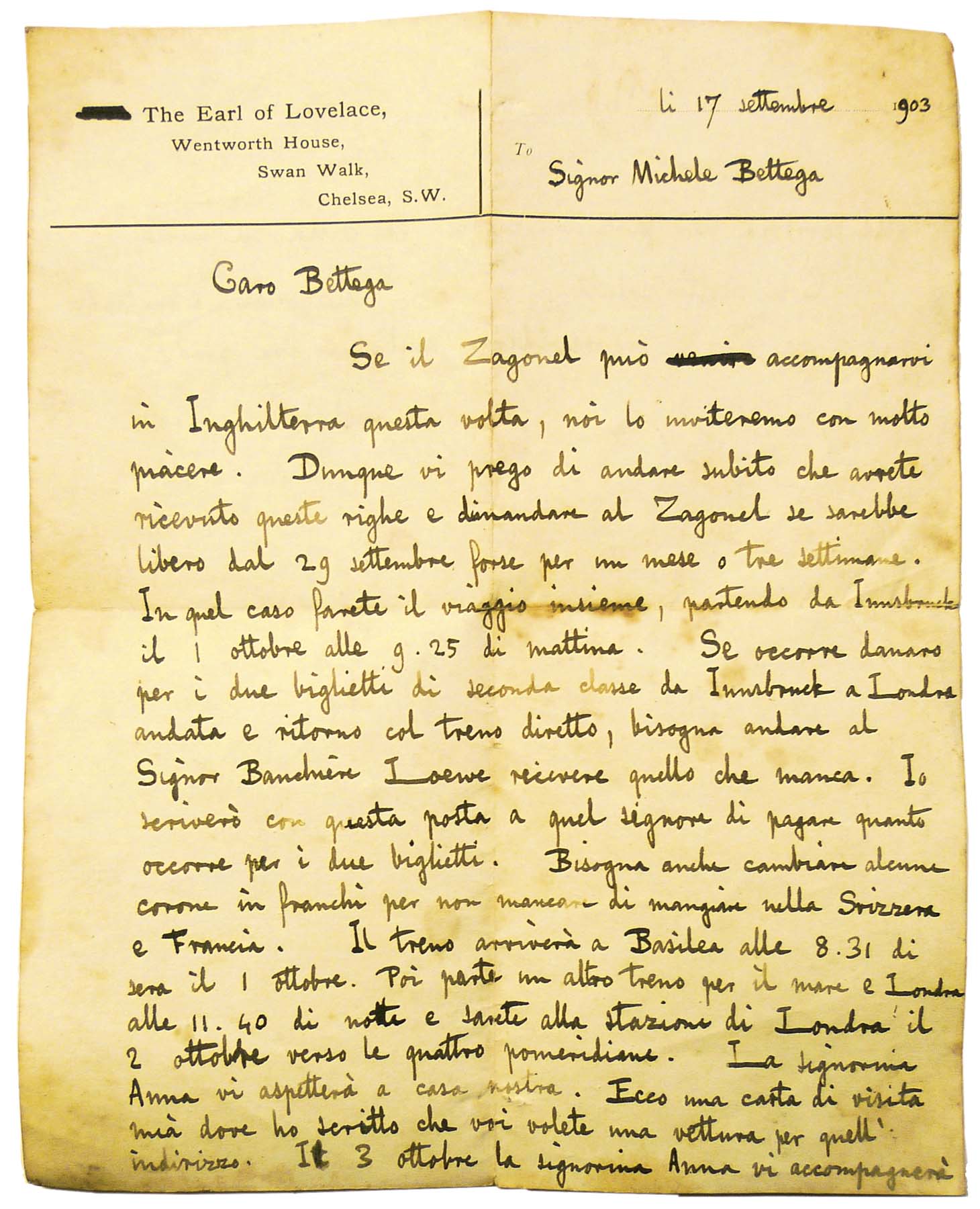 Il titolo nobiliare rimanda ad uno dei due alpinisti accompagnati da Bettega, ossia il Conte di Lovelace, la cui complessa figura è stata rivelata solo di recente nonostante l’araldico appellativo sia echeggiato con frequenza tra le pareti delle Dolomiti di San Martino (e non solo). Dal punto di vista alpinistico, l’assidua frequentazione del gruppo delle Pale- e particolarmente della Val Canali – per il sessantenne Ralph Gordon Milbanke-King ovvero Conte di Lovelace (Middlesex, 1839-Surrey, 1906), corrisponde solo all’ultima parte della sua vasta e ricca esperienza, che fin dal 1871 l’aveva visto in vetta al Cervino (27a salita). Ma oltre il suo alpinismo, sempre votato alla massima discrezione e che rimanda alle vicissitudini di una vita non sempre facile (come la Tomasson, anch’egli lasciò, quali uniche note, quelle scritte nei libretti delle sue guide), ciò che più colpisce è che dietro il nome di Lovelace si celi nientemeno che il nipote del poeta romantico George Gordon Byron.