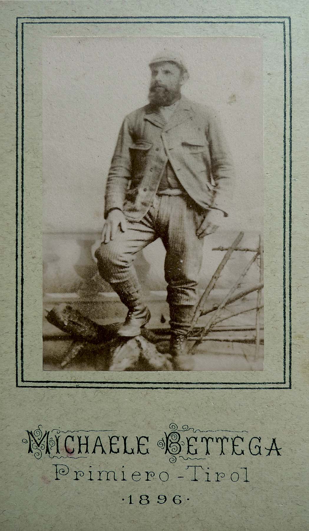 Un primo e fondamentale riscontro biografico su Michele Bettega lo si deve a don Carlo Giacomelli, vice-priore a San Martino tra il 1883 e il 1907, periodo contemporaneo e pienamente sovrapponibile all’attività dell’emblematica guida alpina. Il colto uomo di fede lasciò un memoriale datato 1908 in cui annotò cronache e vicende della comunità in cui aveva operato. Pure in modo approssimativo, il fenomeno alpinistico inteso come espressione sociale non poteva certo passare inosservato all’occhio del curatore d’anime. Se il dato storico rimane piuttosto vago, lo scritto assume invece particolare rilevanza quando diviene sensore del territorio e della sua gente: …il già famoso e rinomato Michele Bettega da Mezzano, domiciliato a Transacqua. Nato da poveri genitori e fin dall’infanzia usato alla parsimonia, alla fatica, all’attività, alla cura del tempo, lungi dal vizio di qualsiasi specie, così sempre si mantenne. La sua prima occupazione fu quella di pastore; a 19 anni si alloggiò presso la famiglia dei Ben di Fiera, quale servo e figlio, con la quale rimase per circa vent’anni, e, siccome pratico del bestiame e della pastorizia, fu quasi sempre occupato in San Martino dai Ben, affittuari generali del Beneficio. Se il sostantivo “figlio” lascia aperto a più di qualche supposizione, certo è che, tra le varie corvée svolte dal ragazzo, c’è pure l’accompagnamento dei turisti alla ricerca dell’avventura alpinistica. E ancora, se risulta praticamente impossibile rintracciare con precisione quanto Bettega compì in alta quota nei primi anni di sottopagata servitù alberghiera (1874 c. prima salita della Cima Pradidali), dall’importante vittoria sulla Pala di San Martino in poi il suo nome si lega ad una moltitudine di scalate – che certifica una redditizia attività autonoma – e ad alcune imprese davvero straordinarie, come la prima ascensione della parete sud della Marmolada di Penìa.
