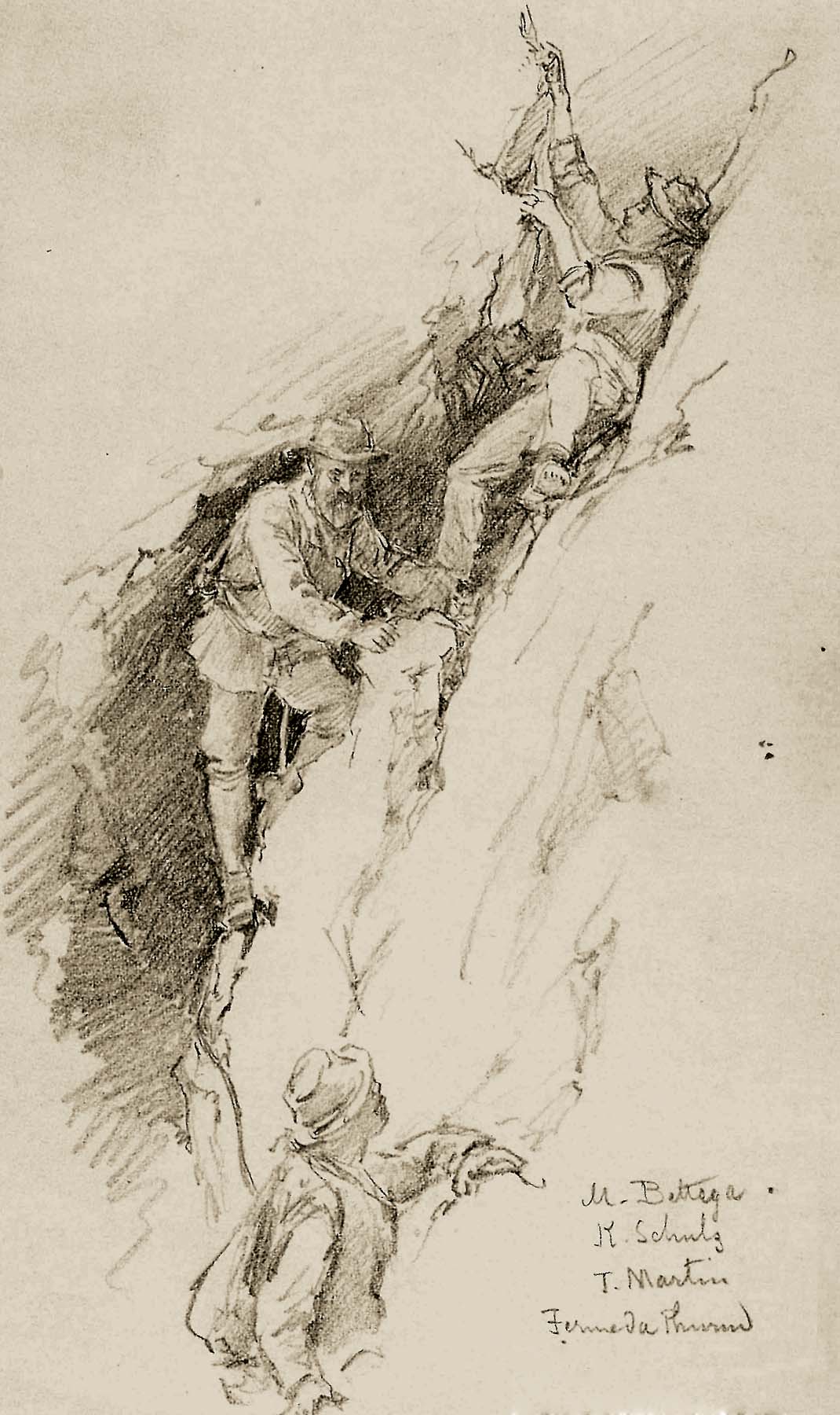 Gioco di rincorse, si diceva, perché l’allora studente di Oxford John Swinnerton Phillimore (Boconnoc, 1873-Shedfield, 1926) e il preside della King’s Westminster School Arthur Guy Sanders Raynor (Maldon, 1863-Westminster, 1935) avevano conosciuto Michele Bettega a San Martino proprio nella stessa estate, qualche settimana dopo il tentativo compiuto con De Toni e i due alpinisti triestini. Insieme a Bettega, Phillimore e Raynor avevano salito Sass Maor, Cimon della Pala, Rosetta, Cusiglio e Cima Canali prima di dirigersi (probabilmente con qualche consiglio) verso la fascinosa Civetta.