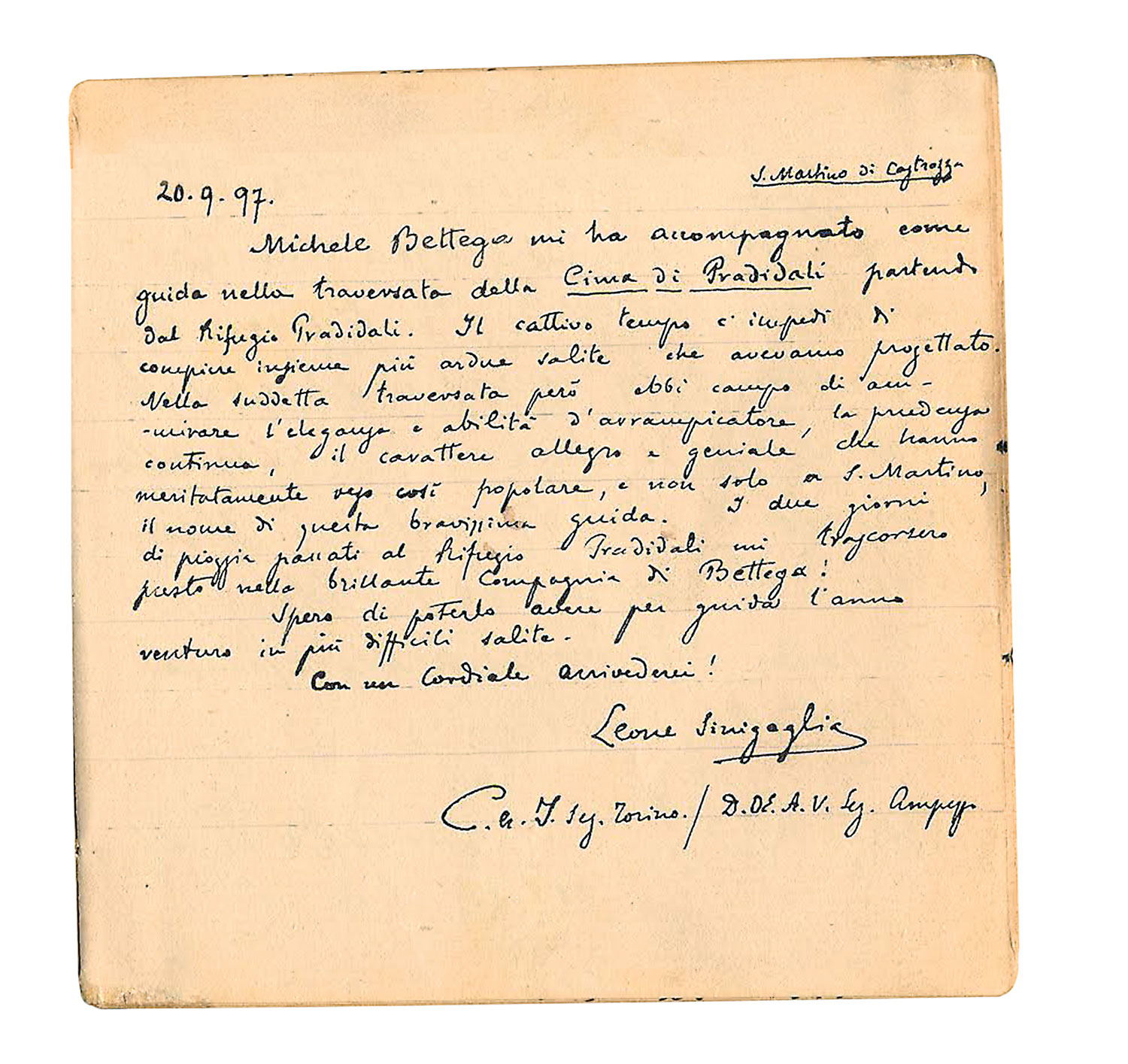 Se rimane fin troppo sintetico, eppure significativo, il commento di un altro suo importante cliente, l’inglese Charles Comyns Tucker, alpinista inscindibilmente legato alle Pale per essere stato non solo il primo sul Sass Maor ma pure sulla Cima Canali proprio con Bettega (…si è dimostrato in questa, come durante altre spedizioni, uno scalatore valido e capace, e un compagno altrettanto allegro e piacevole), ben più indicativo è quanto lascia scritto il musicista e compositore torinese Leone Sinigaglia, tra i pochi nomi forti dell’alpinismo occidentale che si confermarono in quel frangente anche tra le Dolomiti: Michele Bettega mi ha accompagnato come guida nella traversata di Cima di Pradidali partendo dal Rifugio Pradidali. Il cattivo tempo ci impedì di compiere insieme più ardue salite che avevamo progettato. Nella suddetta traversata però ebbi campo d’ammirare l’eleganza e abilità d’arrampicatore, la prudenza continua, il carattere allegro e geniale che hanno meritevolmente reso così popolare, e non solo a S. Martino, il nome di questa bravissima guida. I due giorni di pioggia passati al Rifugio Pradidali mi trascorsero presto nella brillante compagnia di Bettega! Spero di poterlo avere per guida l’anno venturo in più difficili salite – e in effetti fu così.