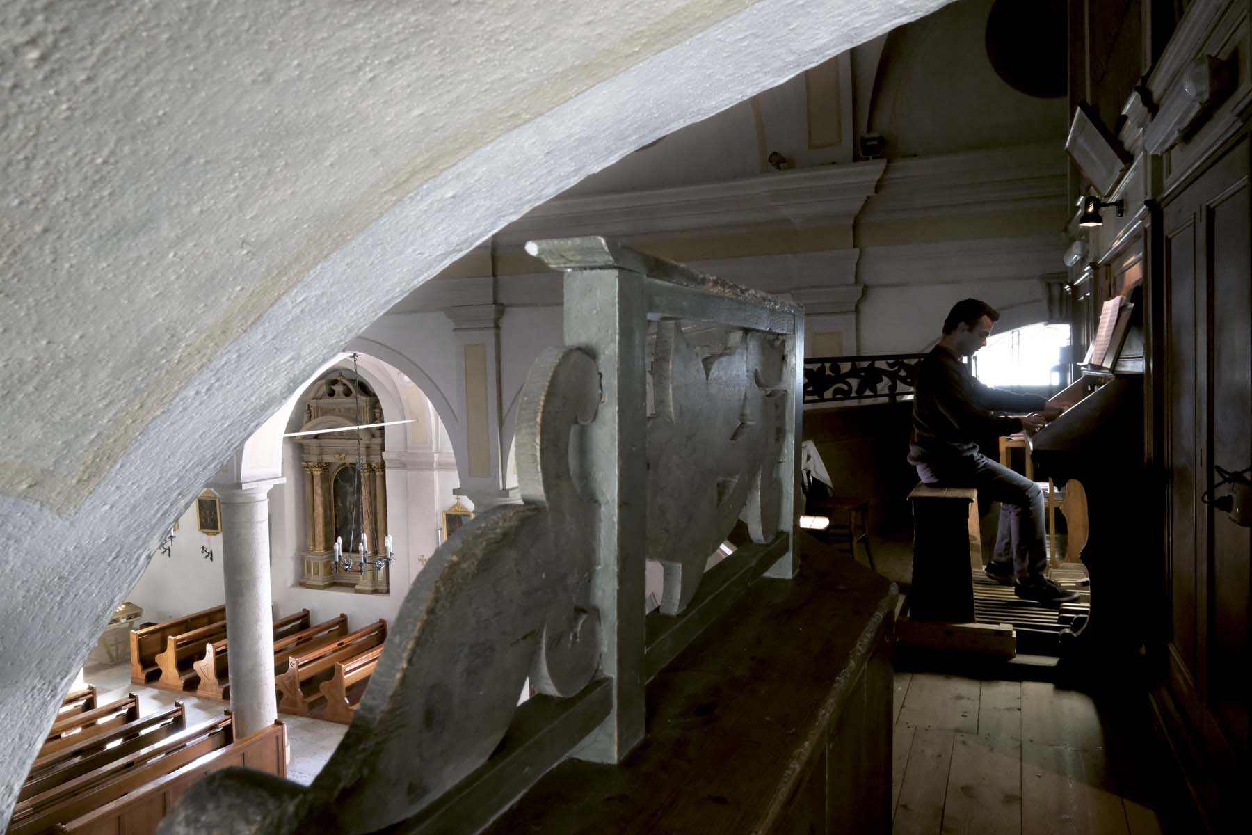 Ogniqualvolta mi ritrovo alle prese con l’organo di San Martino, sia che si tratti di improvvisare o di eseguire repertorio scritto, la scelta stilistica è chiara fin da subito: con un tuffo nel passato, mi immergo negli immensi piaceri intellettuali della polifonia cinquecentesca, in compagnia di Frescobaldi, Diruta, Gabrieli ed altri sommi maestri dell’epoca. Si tratta di uno strumento di piccole dimensioni, che ben si presta all’esecuzione di musica antica italiana: un manuale, una decina di registri e pedaliera. Nel rinascimento si componeva per lo più musica vocale, e in genere con gli strumenti si eseguivano trascrizioni di pezzi vocali: sono veramente pochi i brani scritti espressamente per strumento (o organico strumentale). Caratteristica della scuola italiana è sempre stato il “Ripieno”, timbro di sonorità forte, limpida e cristallina, che permette di eseguire con ottima resa la musica dell’epoca: dalle toccate di Scuola Veneziana (Andrea e Giovanni Gabrieli, Adrian Willaert, ecc.) ai ricercari e canzoni di quella romana (Girolamo Frescobaldi, Giovanni Pierluigi da Palestrina, per citare solo pochi dei moltissimi grandi nomi). Altra peculiarità della scuola antica italiana è il numero ridotto di registri: molto spesso sono solo 4 o 5 (quelli essenziali per poter formare il Ripieno), comunque raramente più di 10.