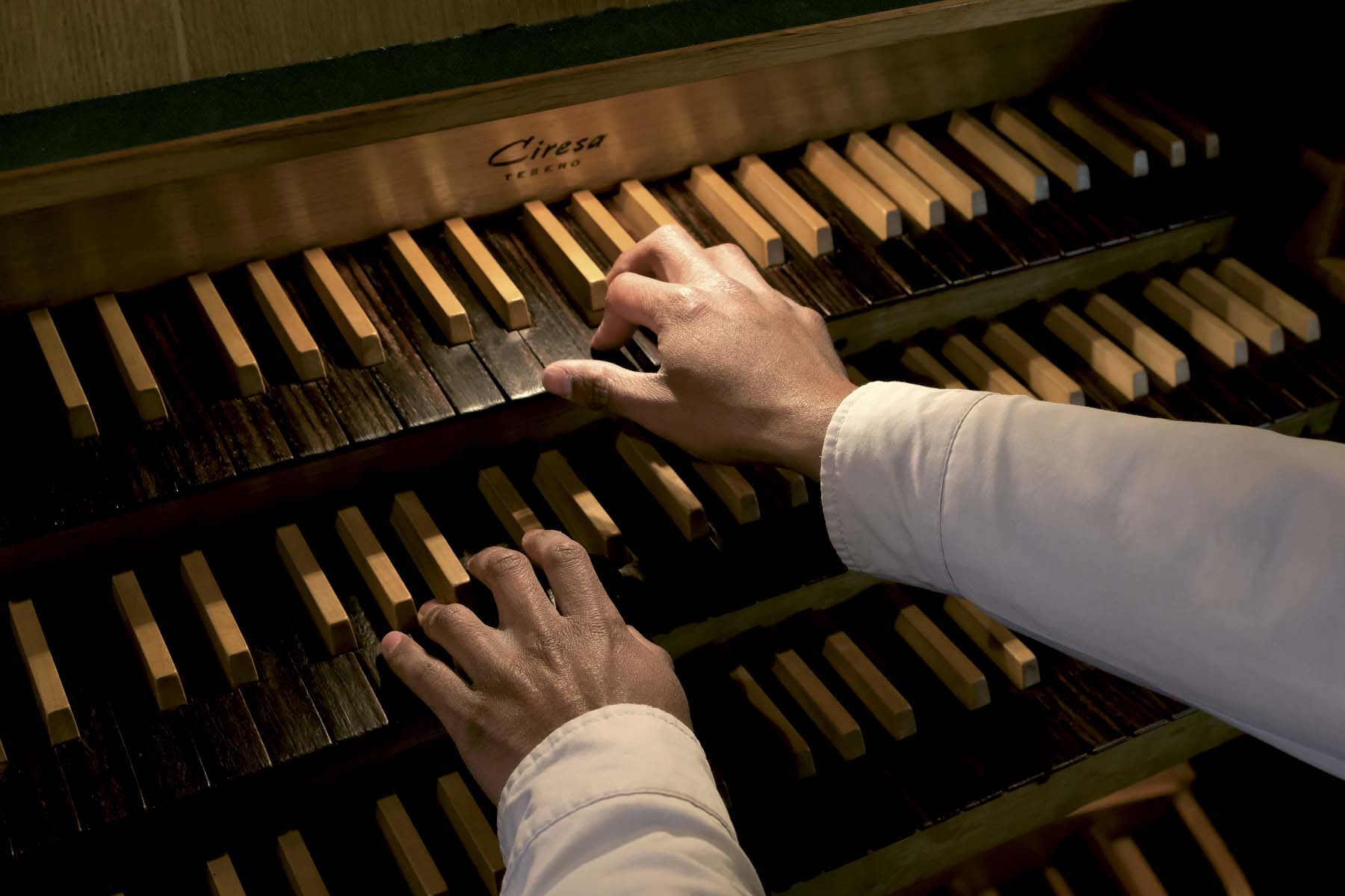 Per stimolare la creatività, la fantasia e la sperimentazione armonica e coloristica, esprimermi quindi attraverso l’arte dell’improvvisazione, l’organo di Mezzano è lo strumento per me ideale, grazie alle sonorità concertistiche ormai pienamente affermate ed integrate negli strumenti novecenteschi. Sempre di fattura italiana, rispecchia in pieno quelle che erano le idee costruttive e sonore del tempo: due manuali, venti registri, circa la metà dei quali orchestrali appunto e pedaliera. È qui presente un accessorio introdotto nell’800, la cassa espressiva: un corpo d’organo è chiuso in una grande cassa di legno, a sua volta chiusa su ogni lato tranne uno, sul quale sono apposte invece delle griglie che si aprono e si chiudono (tramite una staffa presente in consolle), permettendo così di ottenere veri e propri crescendo e diminuendo, piani e forti. È lo strumento perfetto per eseguire le musiche di Marco Enrico Bossi, una delle figure più importanti del panorama musicale novecentesco italiano, ma ben si presta all’esecuzione di una vasta gamma di repertorio di epoche precedenti e successive, in particolare la musica sinfonica francese: Franck, Widor, Vierne, Dupré e molti altri ancora.